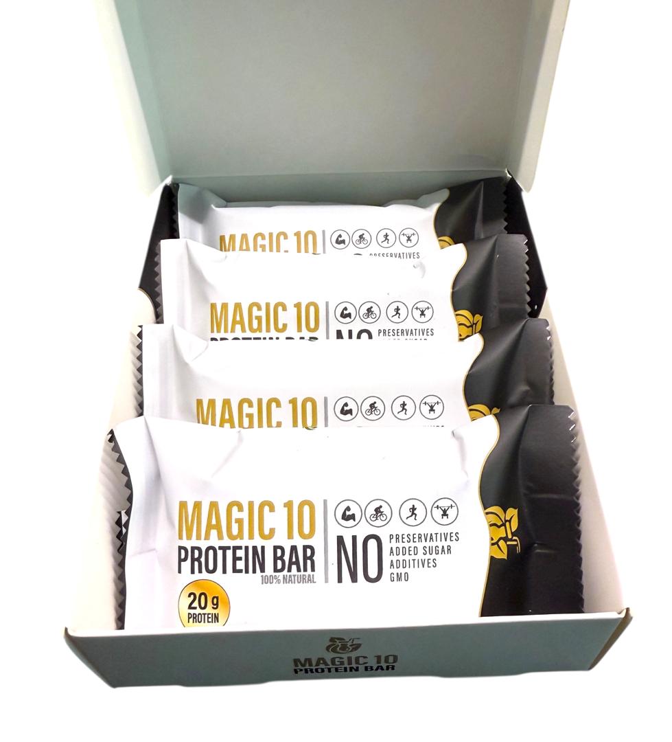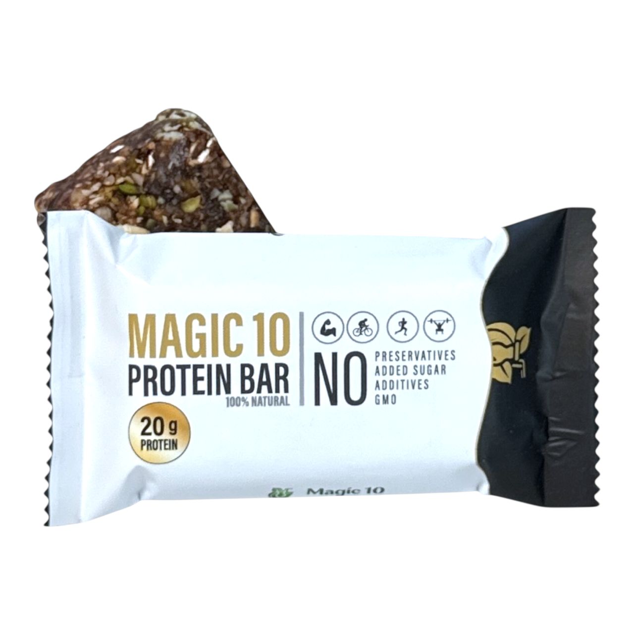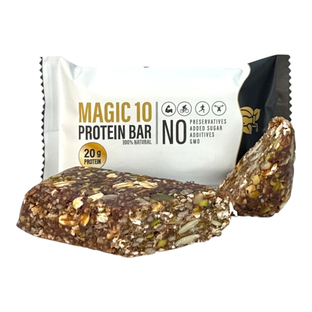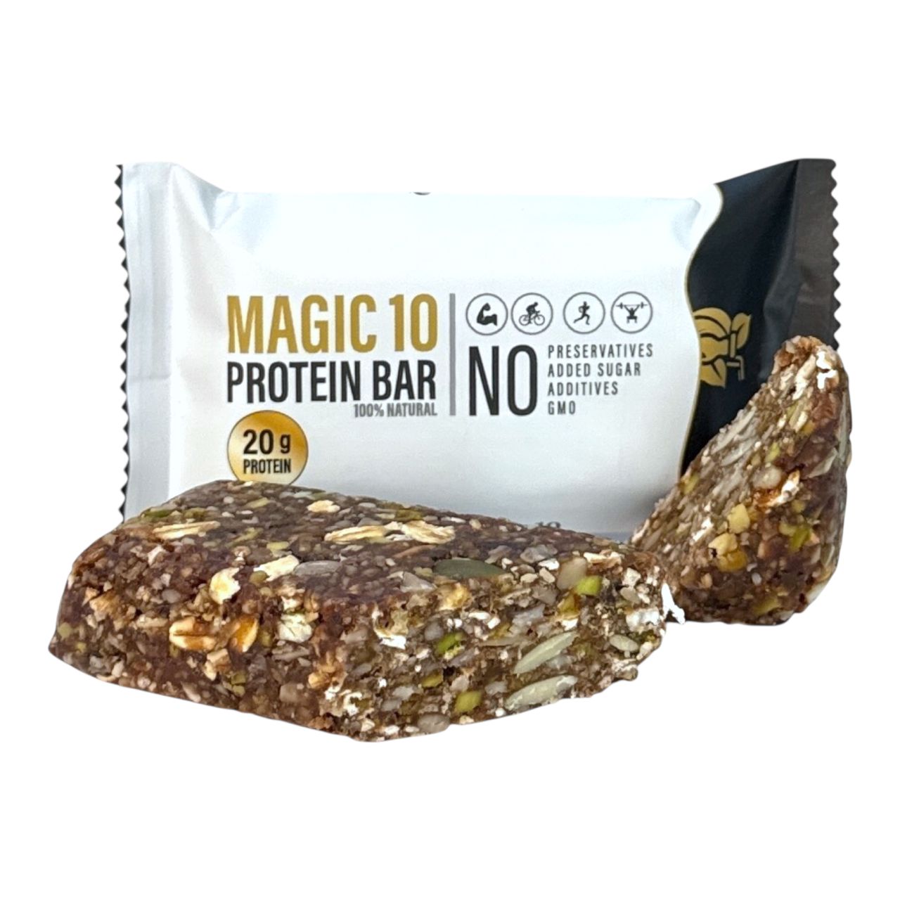 ترکیب طبیعی از دانه ها، خرما، کرنبری، دانهها، جو دوسر – با روکش کنجد و نارگیل و پروتئین وی اختیاری.